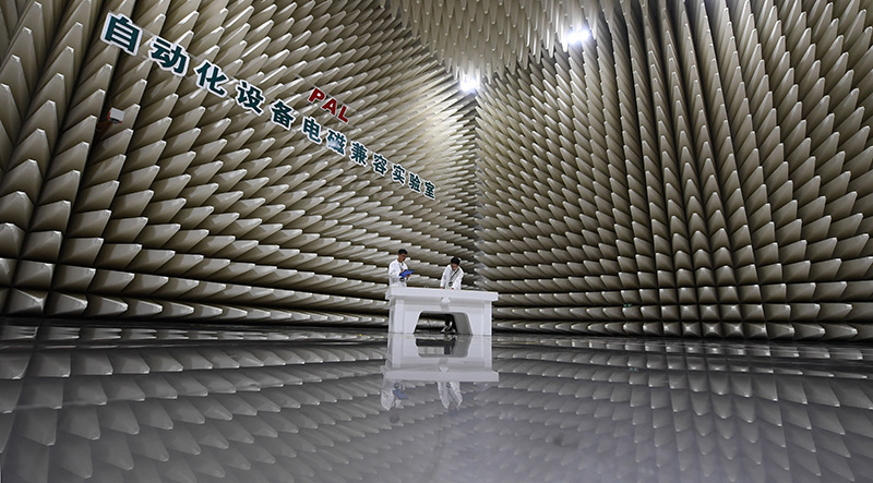在南瑞集团有限公司自动化设备电磁兼容实验室,科研人员在进行辐射发射实验准备工作(2023年7月7日摄)。新华社记者 季春鹏 摄